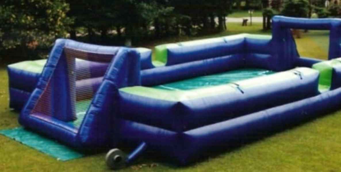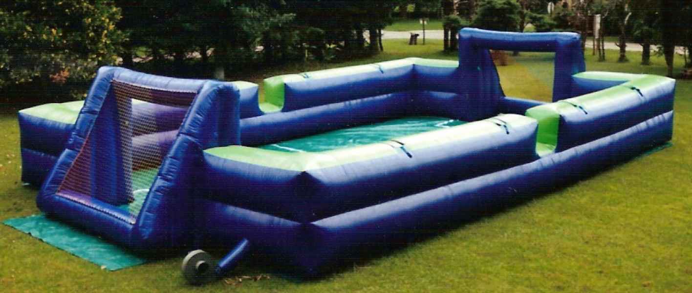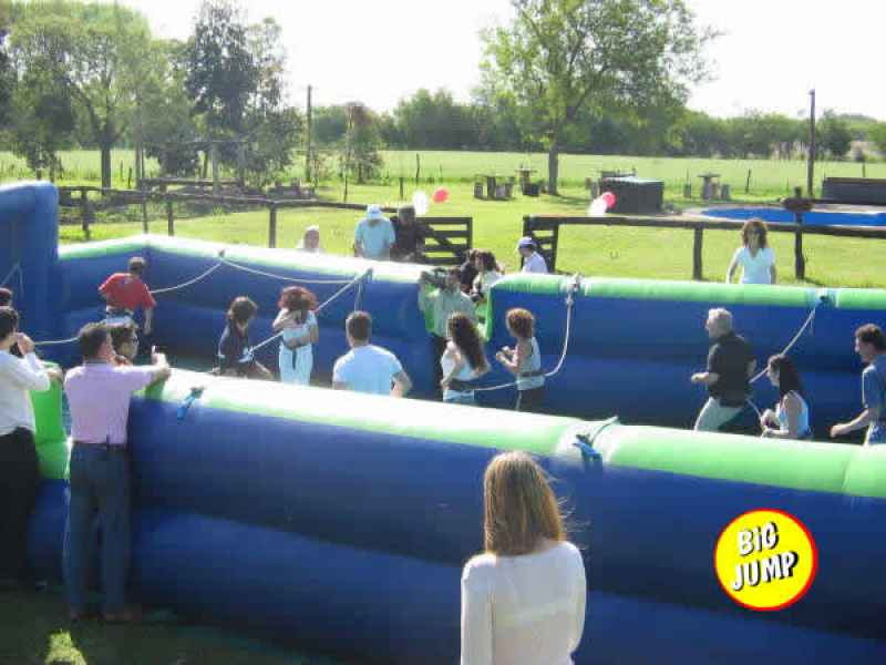 Ahora podés jugar al metegol de una forma muy original... te animás a jugar al fútbol sin correr? Se trata de una CANCHA DE FUTBOL INFLABLE que puede utilizarse de dos maneras: para jugar al fútbol tradicional (libre); o como Metegol Humano para lo cual te colocarás un arnés que sólo te permitirá moverte lateralmente, transformándote en un auténtico muñequito de metegol. El juego es apto para niños y adultos. La capacidad en la modalidad de metegol humano es de 12 personas.