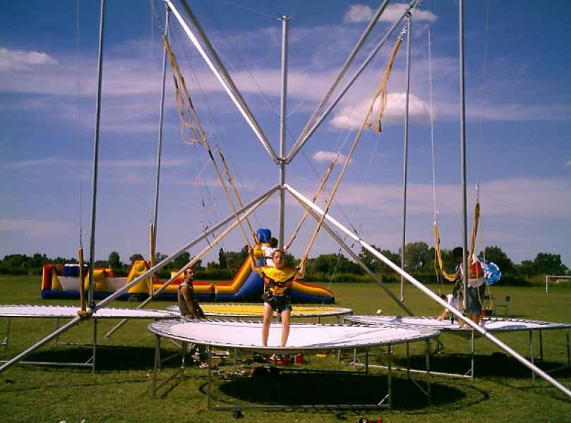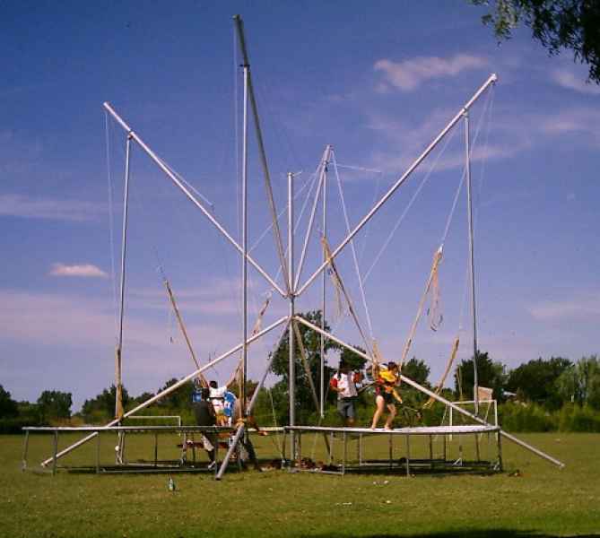 Saltá hasta tocar el cielo con las manos!!! Espectacular juego mecánico compuesto por 4 camas elásticas en el que los participantes alcanzarán alturas realmente increíbles brincando sobre su cama elástica y sujetos por un arnés de seguridad. Pueden participar 4 personas a la vez (1 por cama elástica). Ideal para grandes eventos. Recomendado para niños a partir de los 5 años hasta adultos.