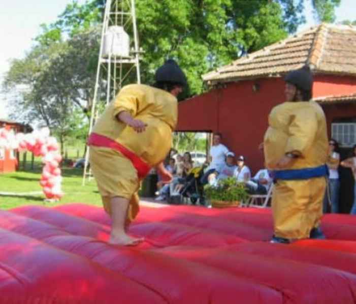 Disfrazate con los trajes que imitan el cuerpo de los luchadores de sumo, subite a la plataforma inflable y derribá a los panzazos a tu contrincante sobre el área de lucha. Se recomienda para niños mayores de 12 años hasta adultos.